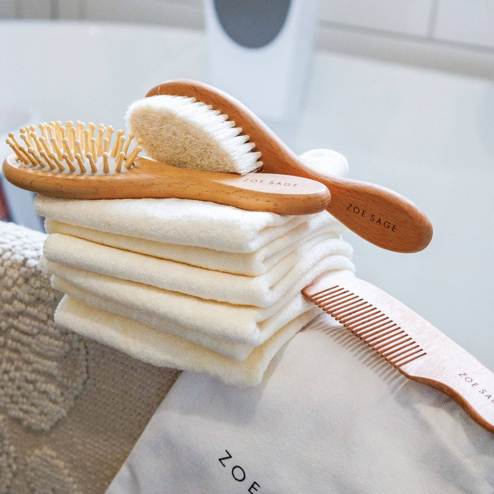 Crafted from natural beechwood and ultra-soft goat hair, this set gently massages your baby’s scalp, supports healthy hair growth, and helps prevent cradle cap – all while turning grooming time into a calming bonding experience.