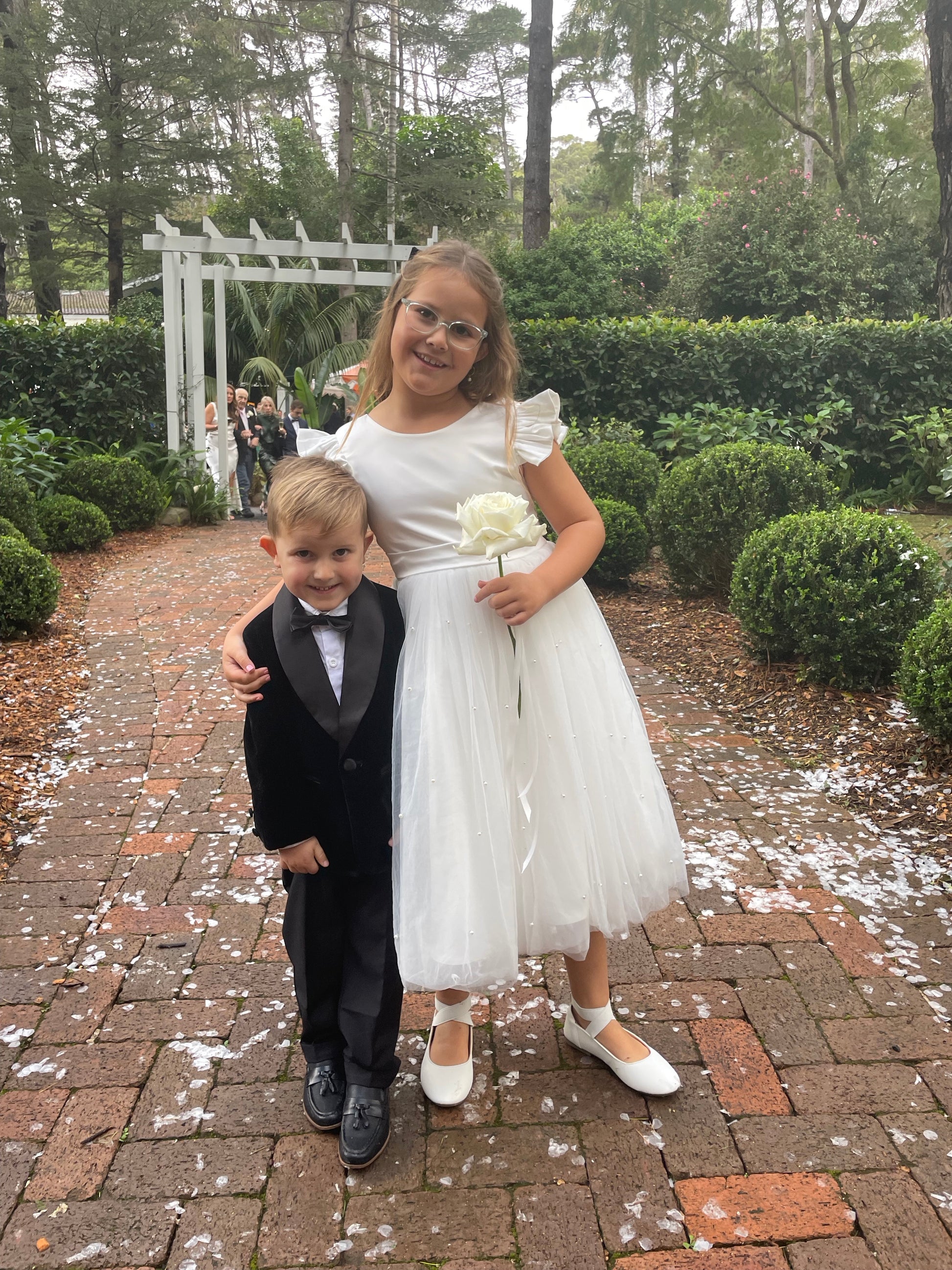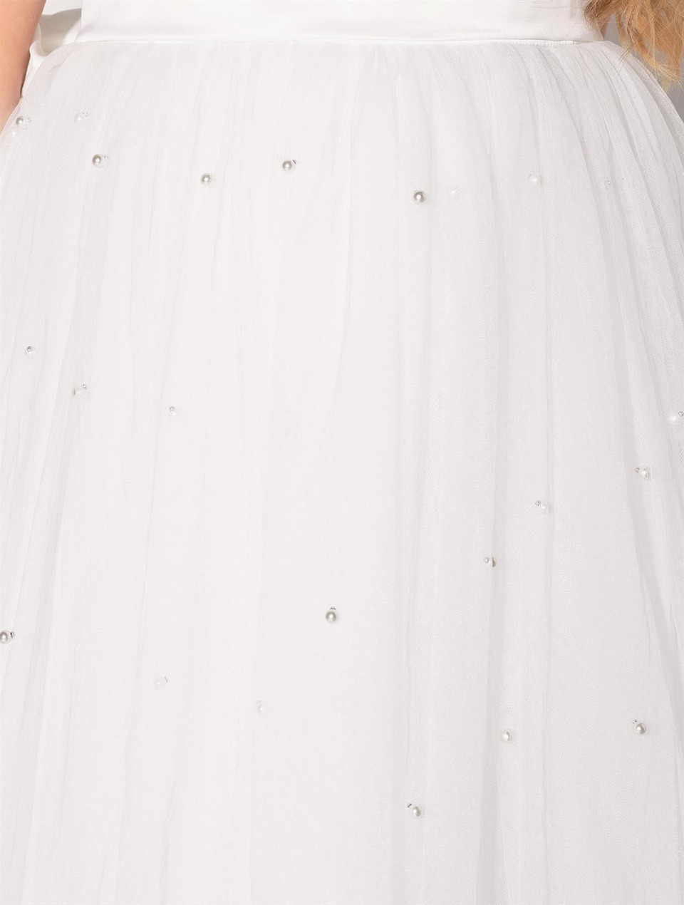 Satin, tulle and pearl detail this dress is suitable for all special occasions. Satin bodice with ruffle shoulde detail. V back, zip back opening. Attached waistband and back bow detail too. Add a soft tulle skirt with elegant pearl detail. Oh so perfect!