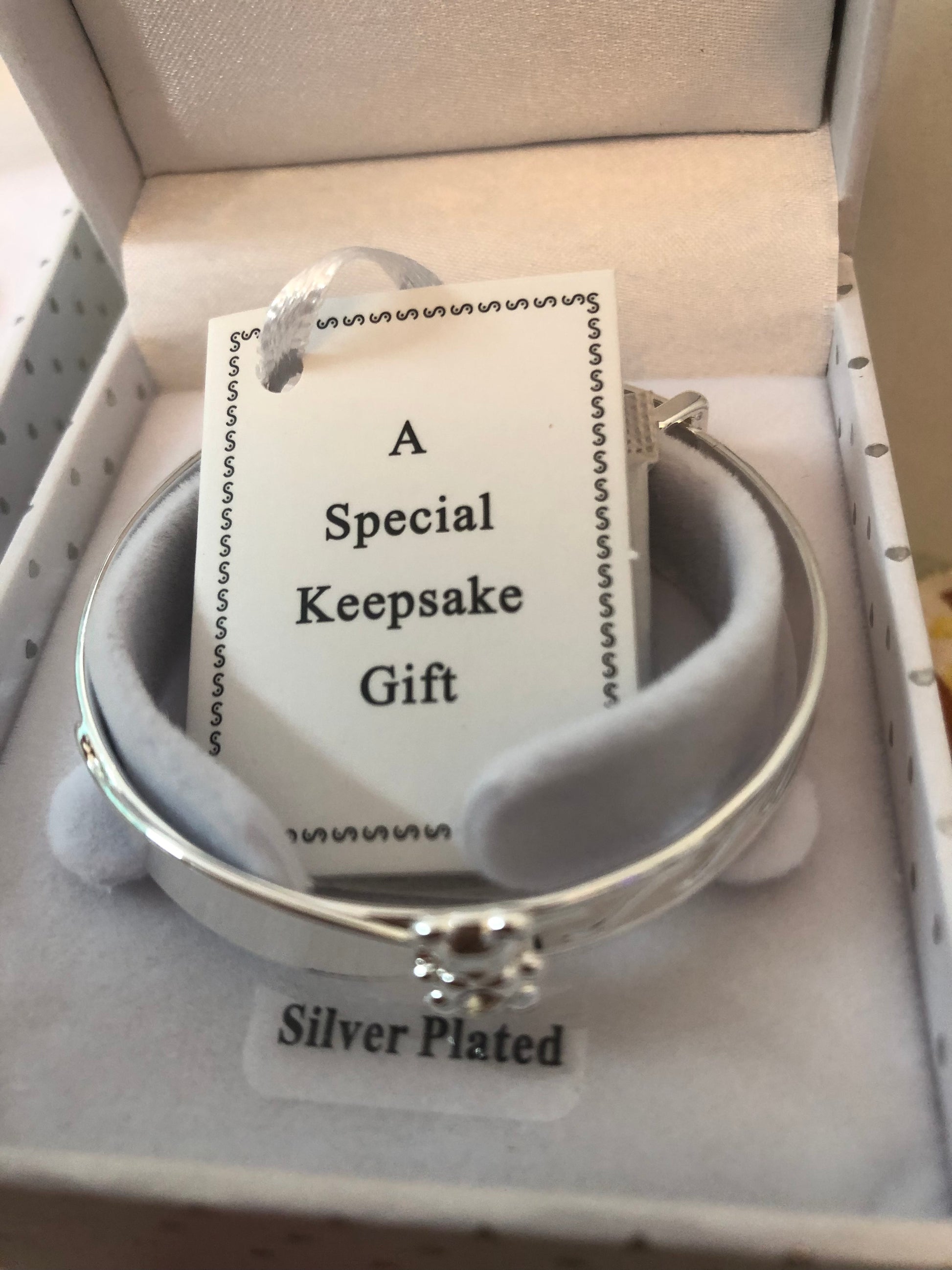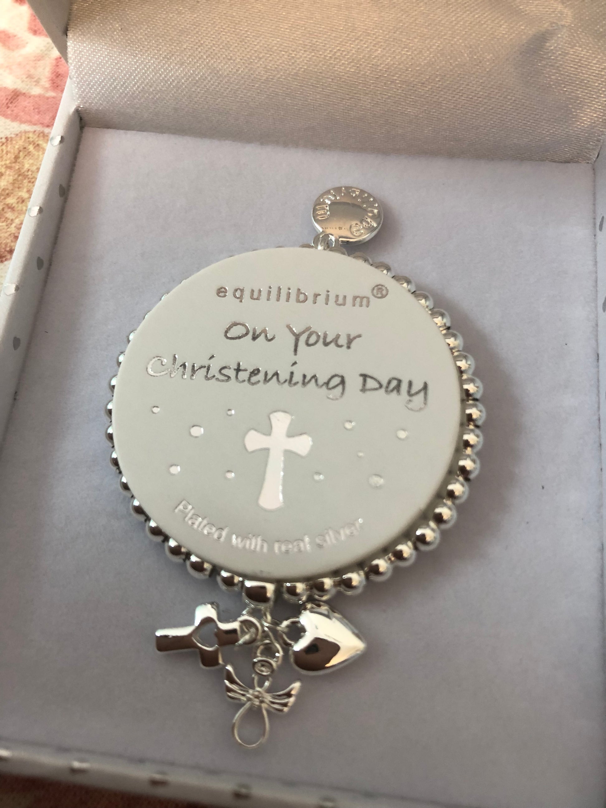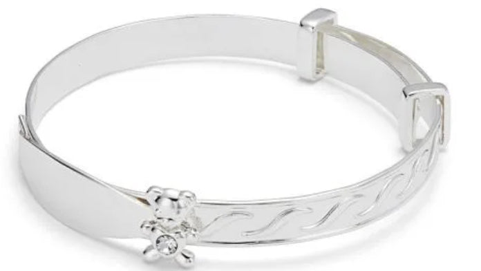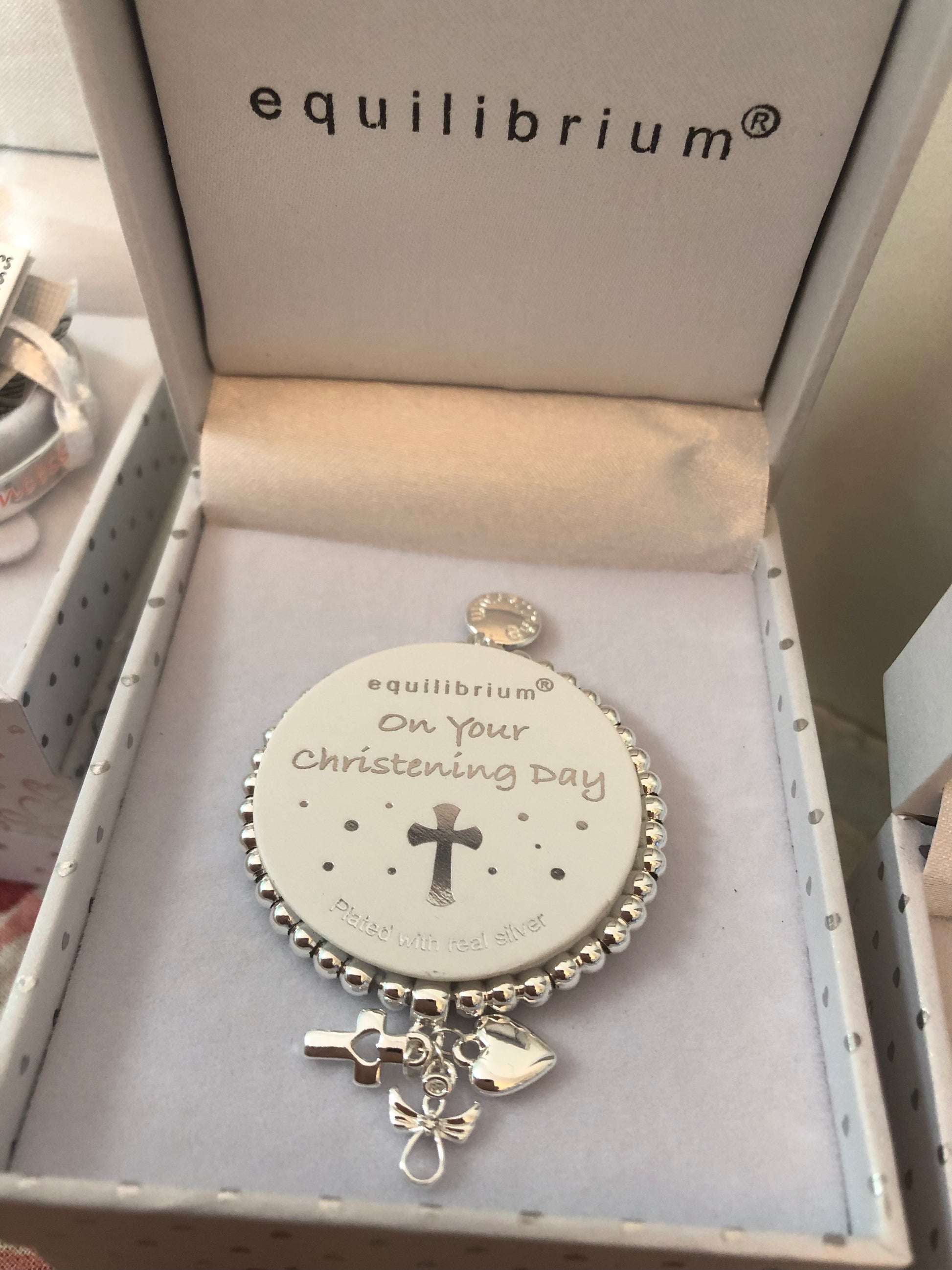 Beautifully crafted Equilibrium baby bracelets are silver plated, perfect as baptism or christening gift.