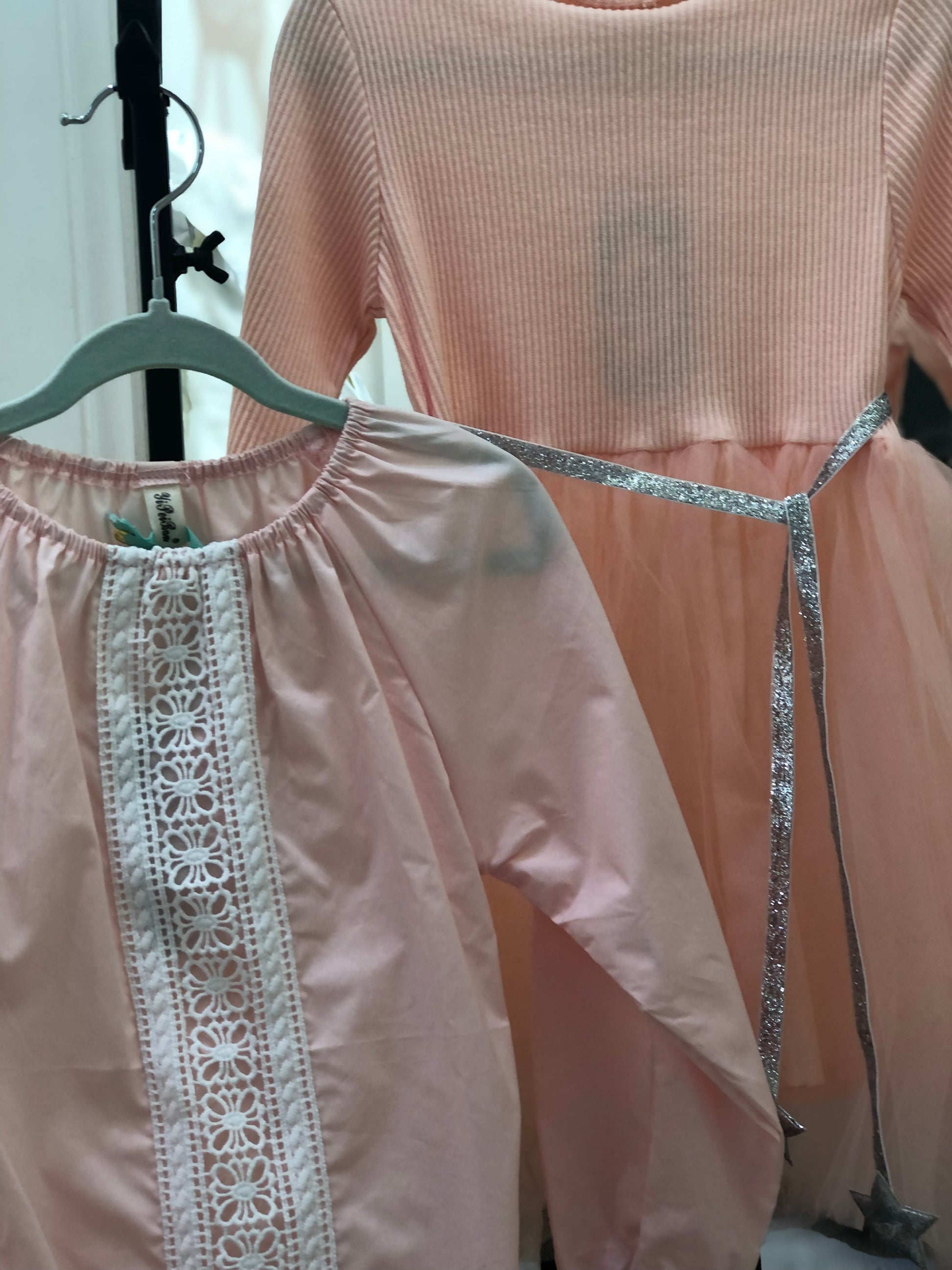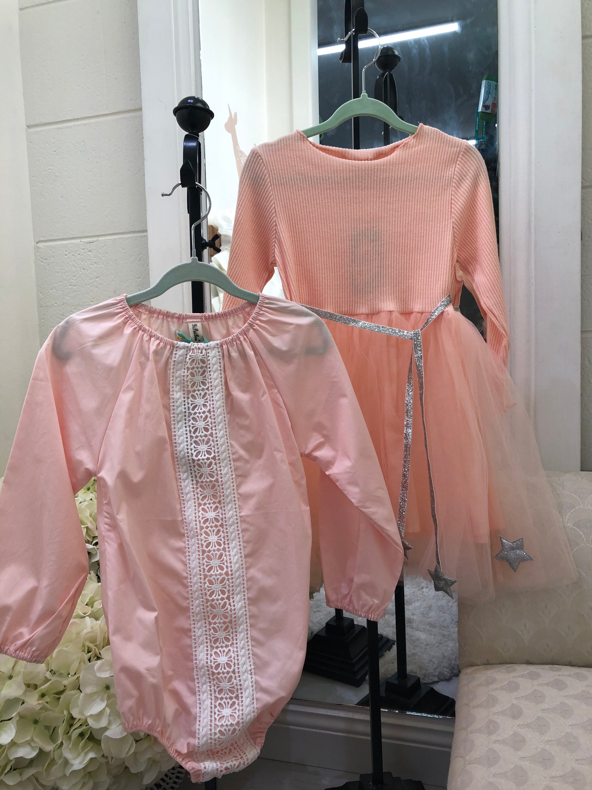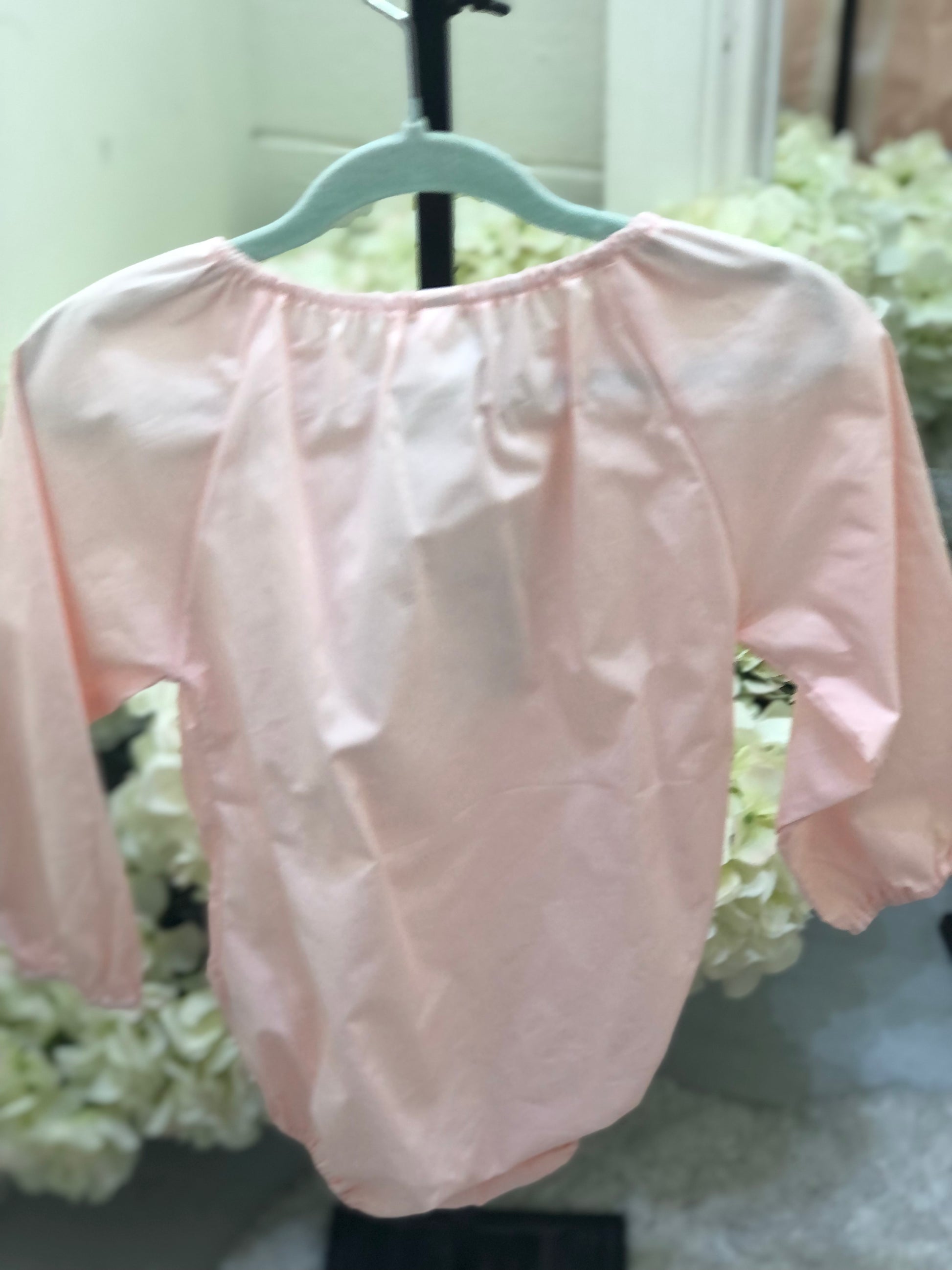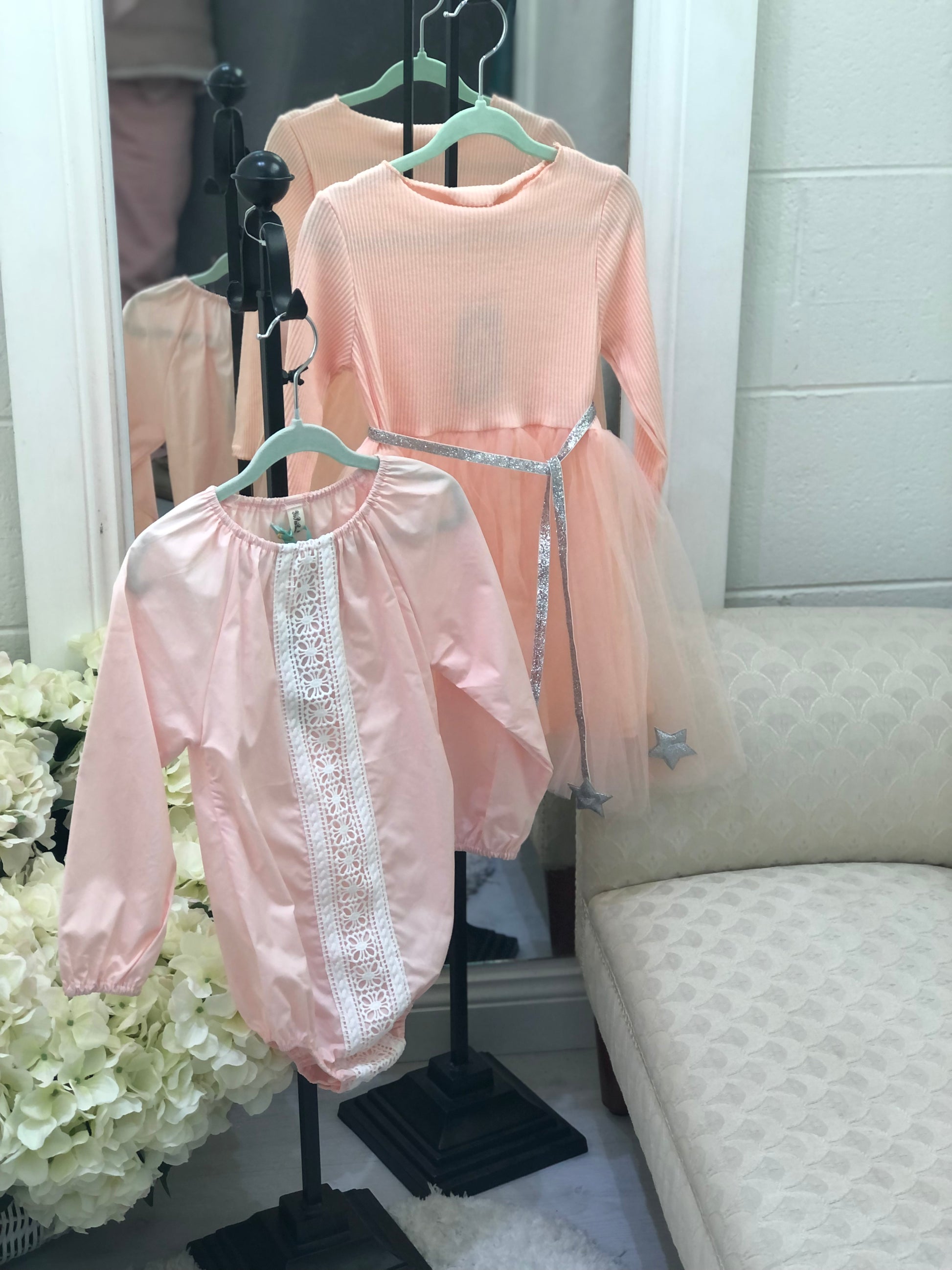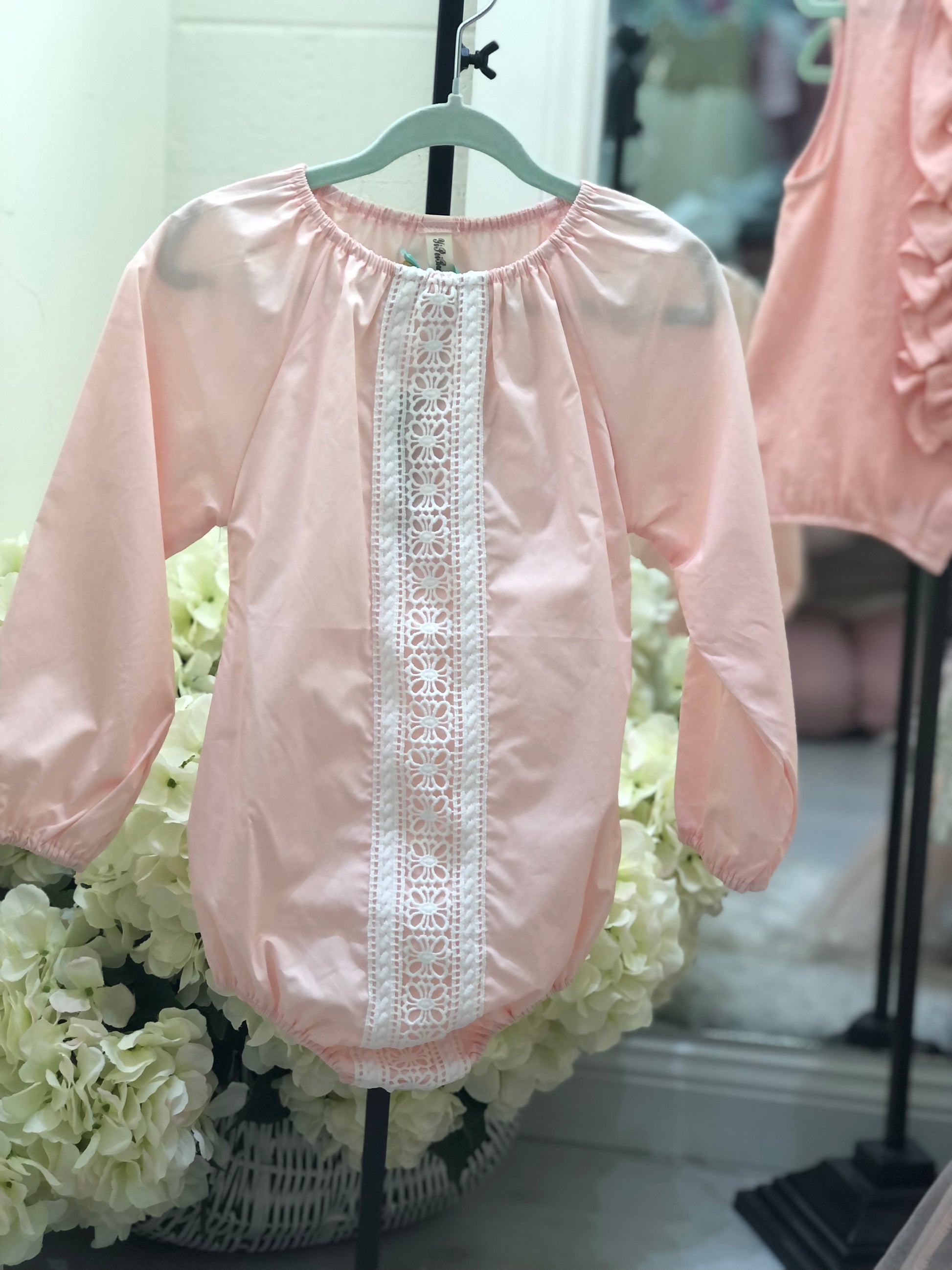 A soft muted apricot with a touch of lace, 100% cotton romper. Elastic at neckline, wrist and leg for comfortable fit. An oversized fit makes this a easy wear piece.