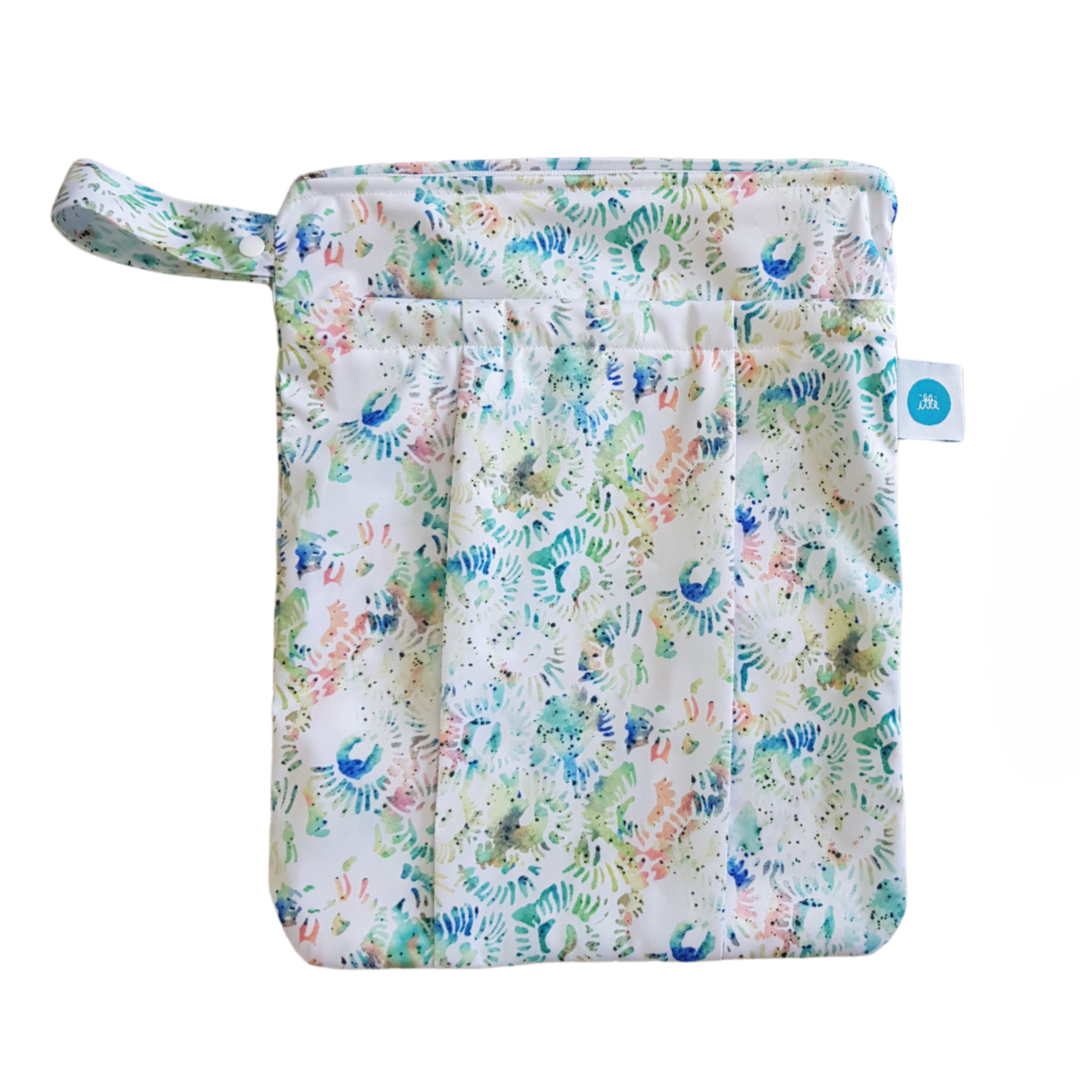 Holds wet and dry nappies at the same time plus holds in smells. Snap handle to hang off a pram, change table or door handle.