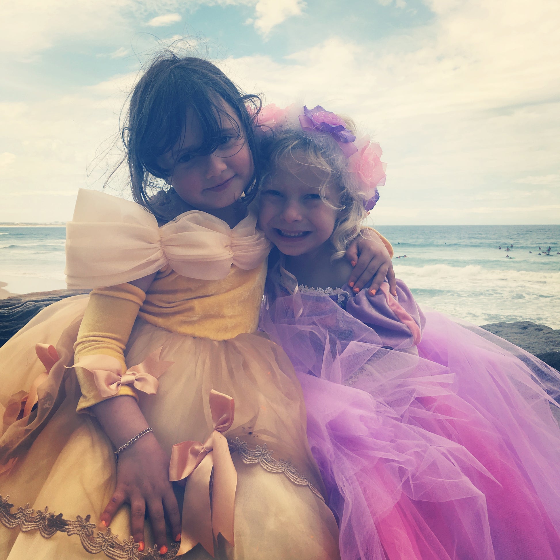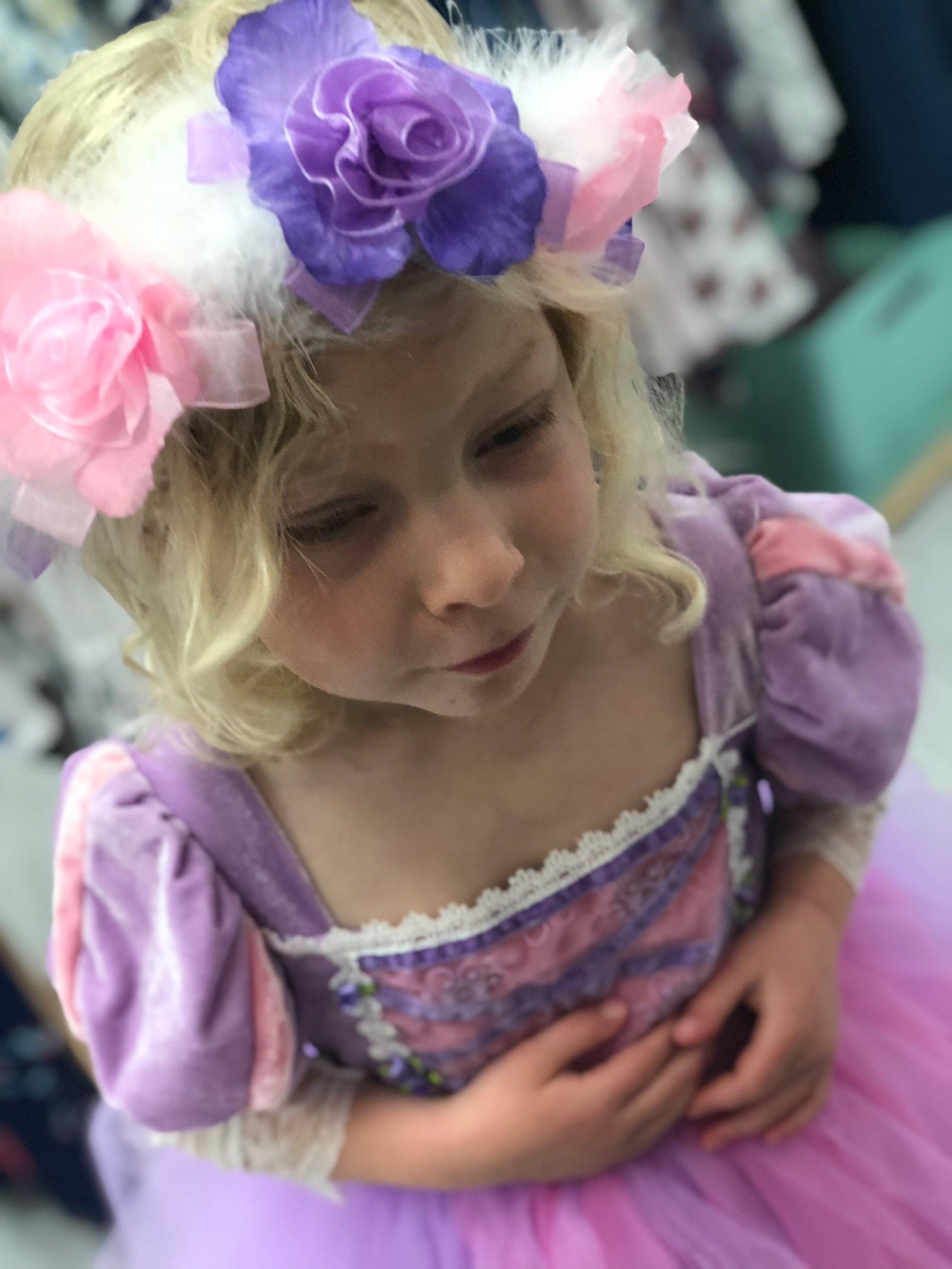 Beautifully detailed Rapunzel Tangled Costume, a mix of soft lavender and pink. Long Sleeve with velvet bodice, embellished with lace for added detail. Tulle skirt and cotton underskirt for comfort and breathability.