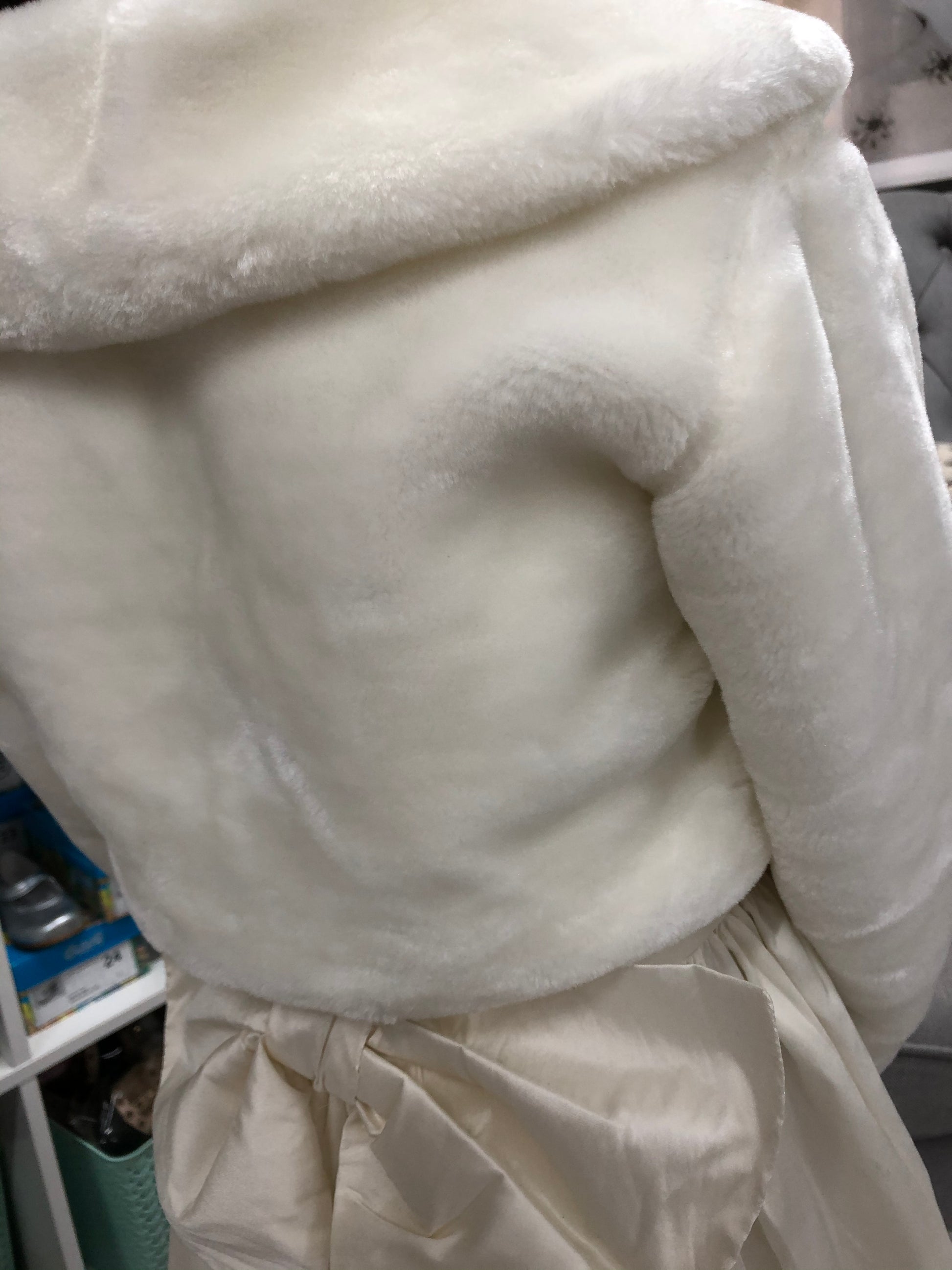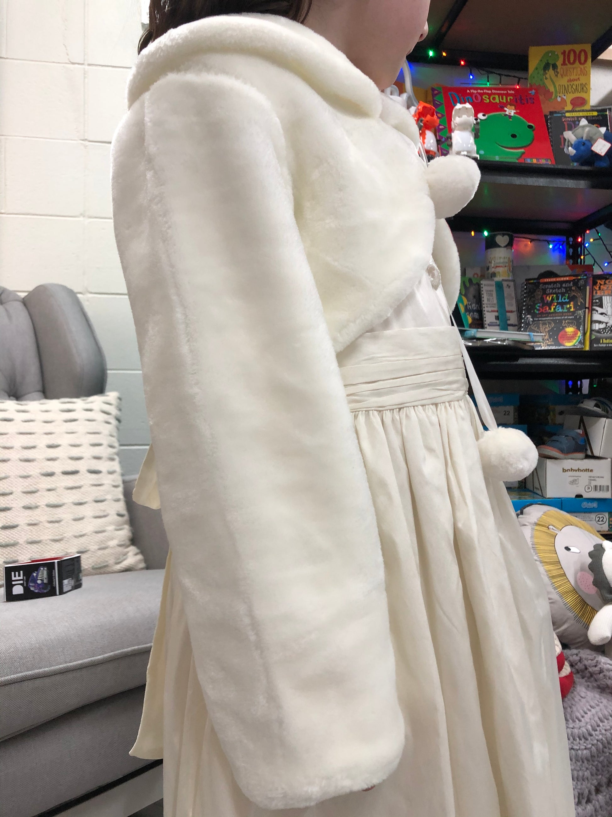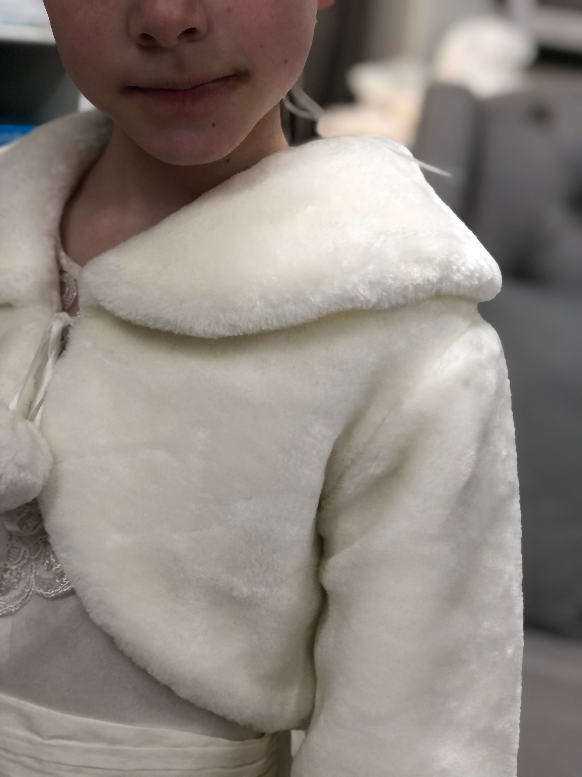 A long sleeve bolero style faux fur winter white jacket. Pom Pom tie detail and fully lined make this an essential for any special occasion during winter. Please note this is an off white jacket.